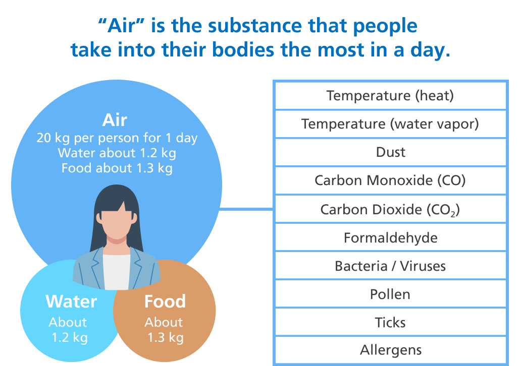 Approximately 20 kilos. Do you know what this number represents? This is the amount of air that people inhale each day.*1 Intake of water is about 1.2 kilos, and food is about 1.3 kilos, which means that our daily use of air far outweighs that of food and water. Knowing this, you can easily understand that air quality is just as important as food and water quality.