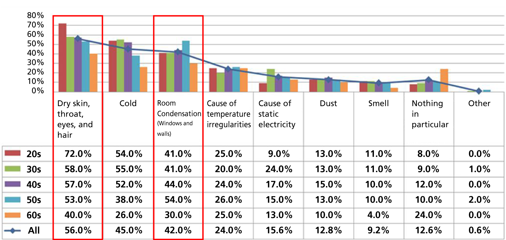 In a survey for air conditioner users "Do you have any problems with the indoor environment in winter?“, the No. 1 answer was "Dry skin, throat, eyes, and hair (56%)".