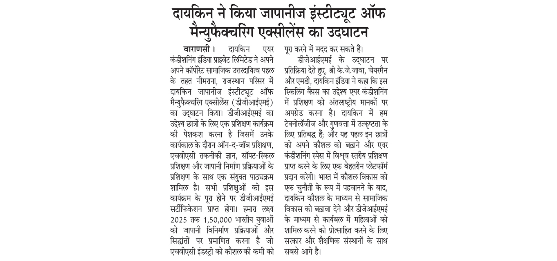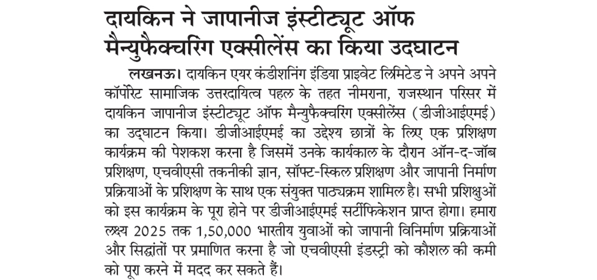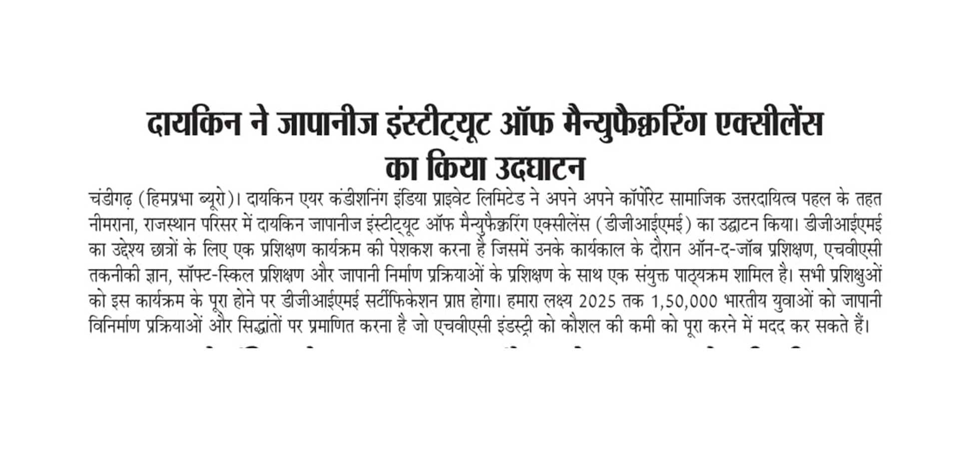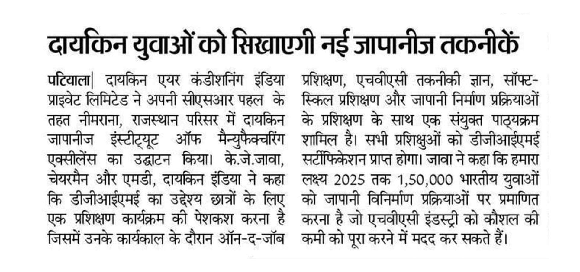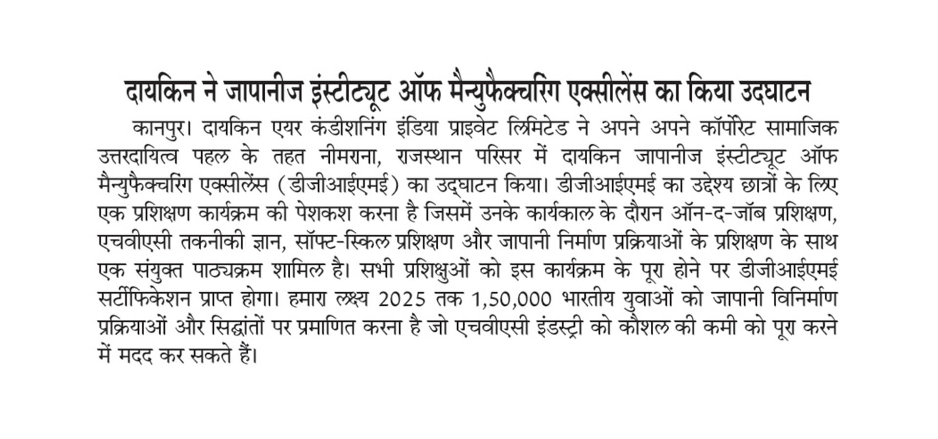 As part of its Corporate Social Responsibility vision, Daikin Air-conditioning India Pvt Ltd (Daikin India) has inaugurated Daikin Japanese Institute of Manufacturing Excellence (DJIME) campus at Neemrana, Rajasthan. DJIME aims to offer training programmes based on a curriculum that will include on-the-job training (OJT), HVAC technical know-how, soft-skills and Japanese manufacturing processes. All trainees will receive a DJIME certification upon completion of this programme. The students would be trained in the areas of safety, quality, discipline, Kaizen and other Japanese shop floor practices, essential to be successful at the workplace. The aim is to reach, educate and certify 1,50,000 Indian youth by 2025 to help the HVAC industry overcome the skill shortage.