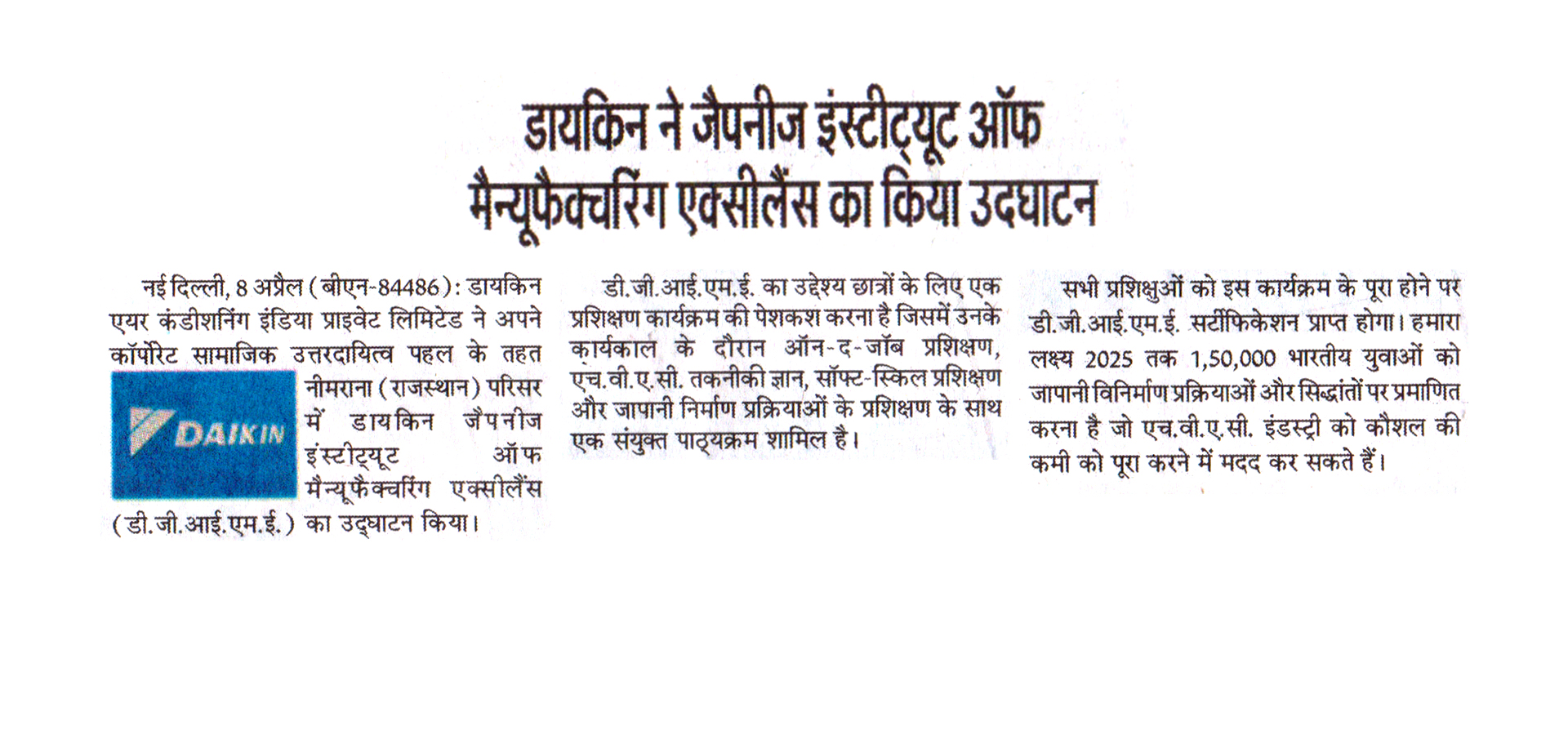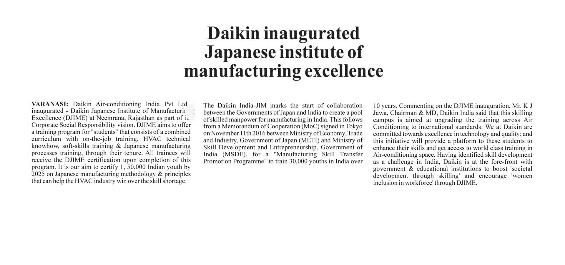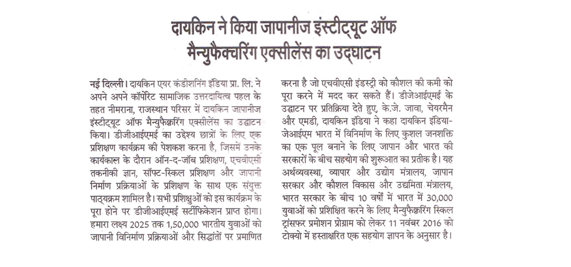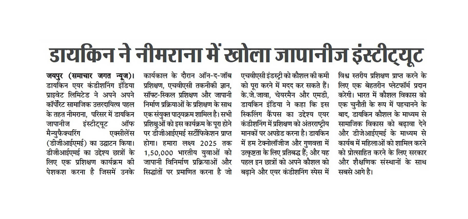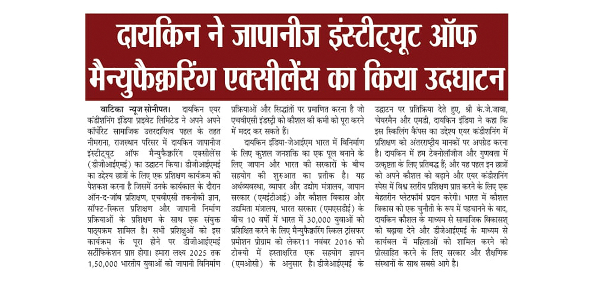As part of its Corporate Social Responsibility vision, Daikin Air-conditioning India Pvt Ltd (Daikin India) has inaugurated Daikin Japanese Institute of Manufacturing Excellence (DJIME) campus at Neemrana, Rajasthan. DJIME aims to offer training programmes based on a curriculum that will include on-the-job training (OJT), HVAC technical know-how, soft-skills and Japanese manufacturing processes. All trainees will receive a DJIME certification upon completion of this programme. The students would be trained in the areas of safety, quality, discipline, Kaizen and other Japanese shop floor practices, essential to be successful at the workplace. The aim is to reach, educate and certify 1,50,000 Indian youth by 2025 to help the HVAC industry overcome the skill shortage.