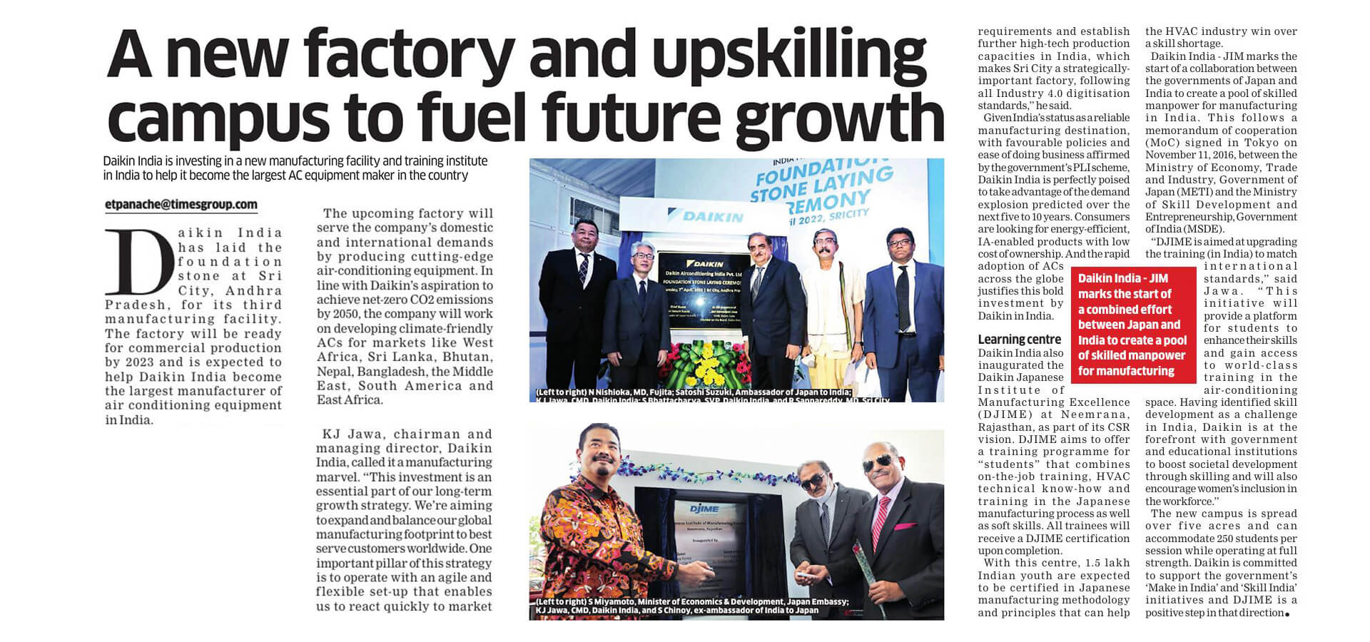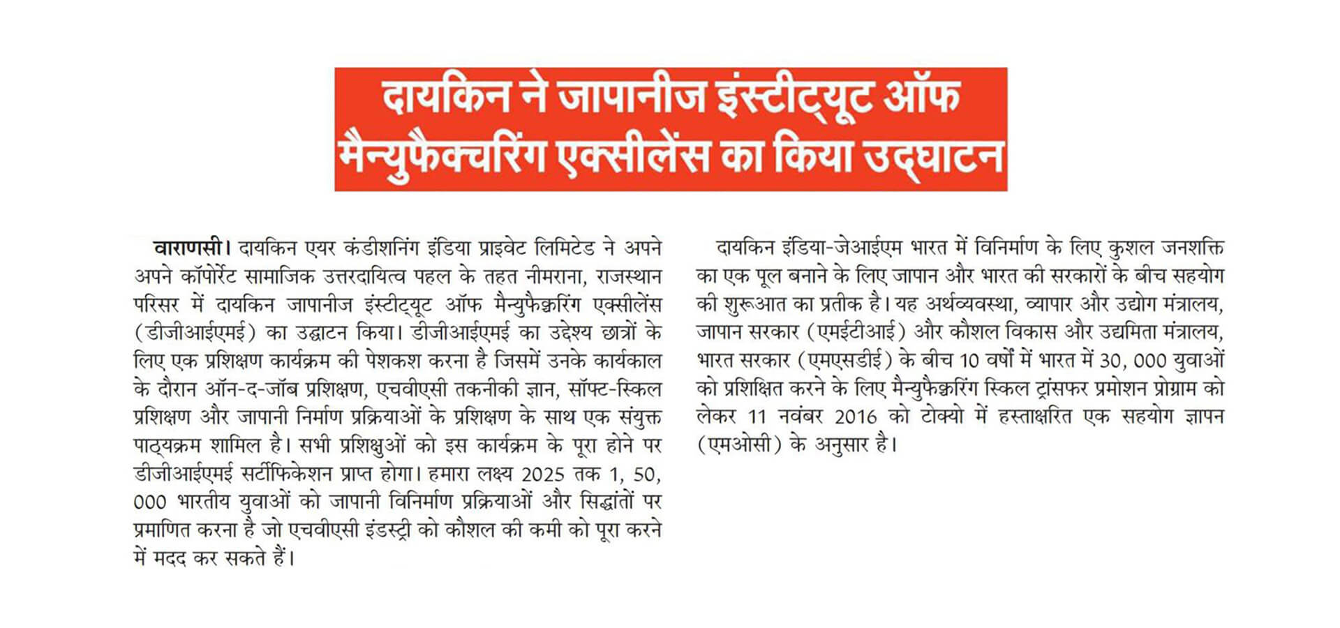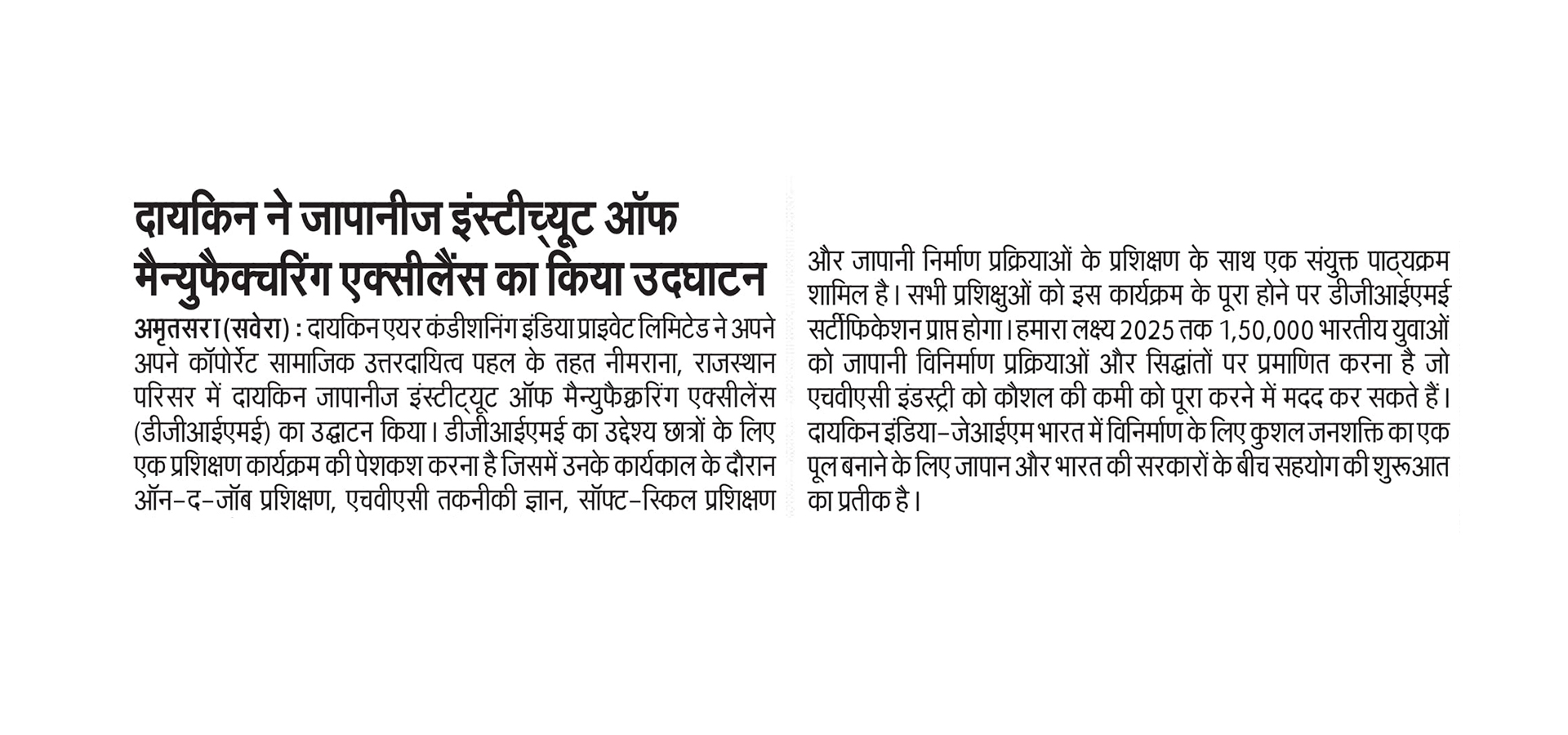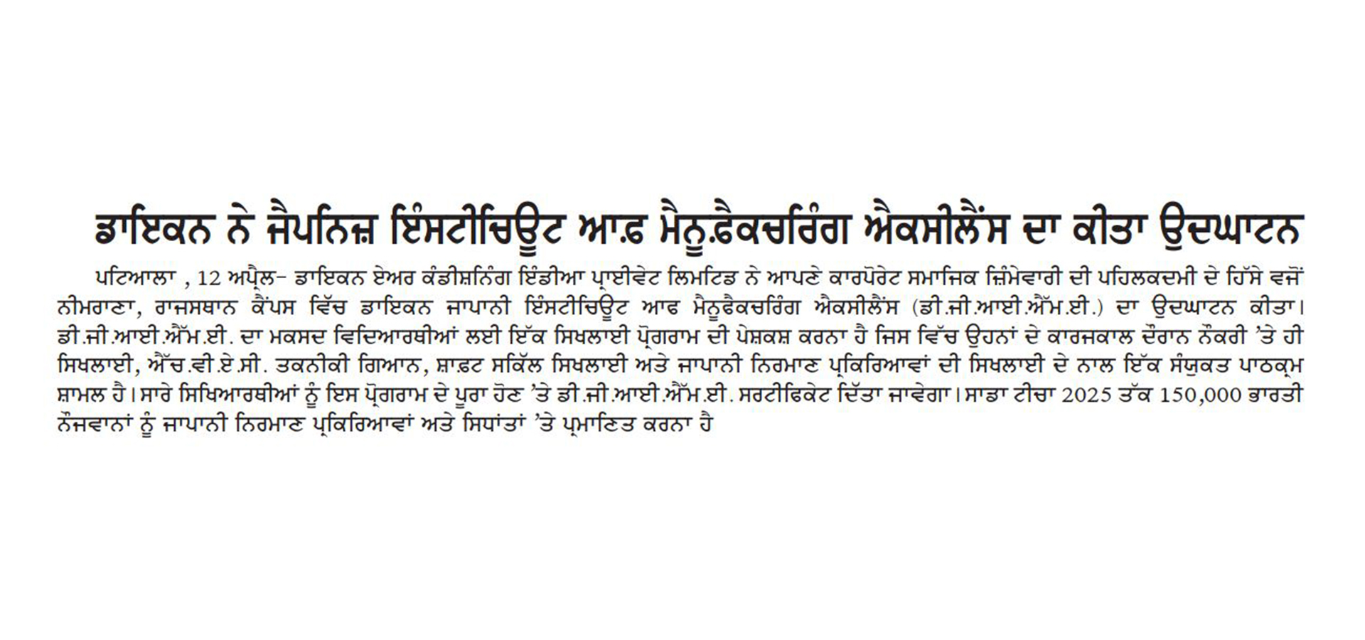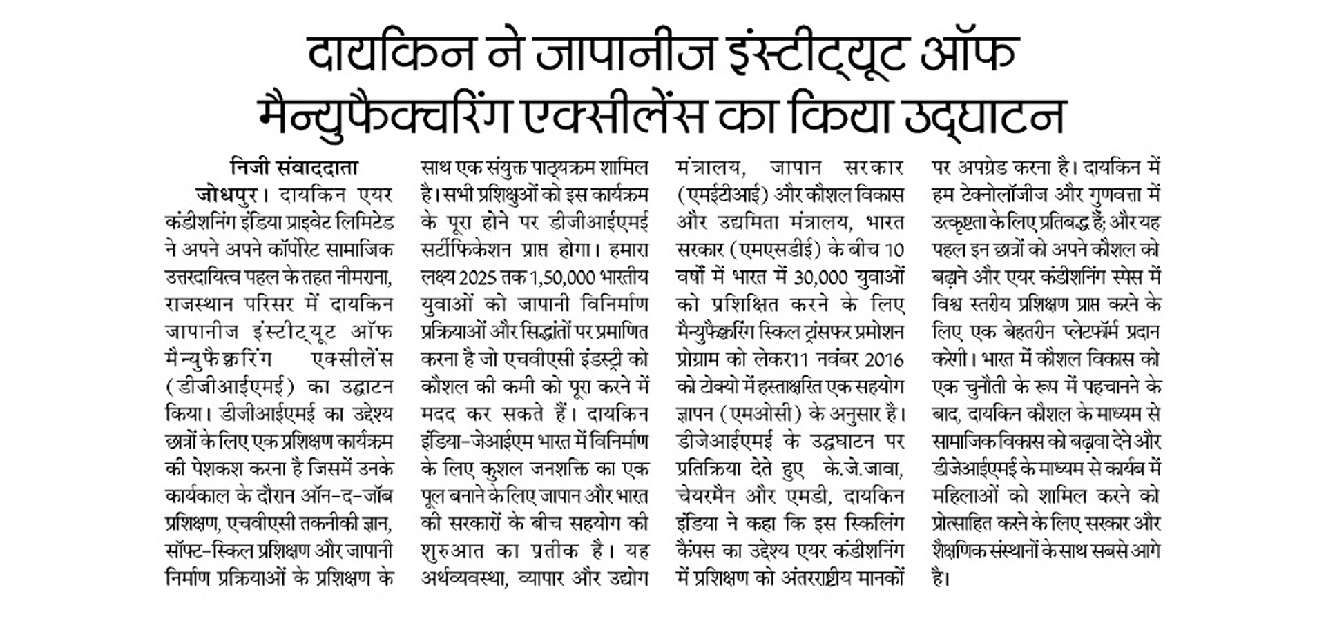 As part of its Corporate Social Responsibility vision, Daikin Air-conditioning India Pvt Ltd (Daikin India) has inaugurated Daikin Japanese Institute of Manufacturing Excellence (DJIME) campus at Neemrana, Rajasthan. DJIME aims to offer training programmes based on a curriculum that will include on-the-job training (OJT), HVAC technical know-how, soft-skills and Japanese manufacturing processes. All trainees will receive a DJIME certification upon completion of this programme. The students would be trained in the areas of safety, quality, discipline, Kaizen and other Japanese shop floor practices, essential to be successful at the workplace. The aim is to reach, educate and certify 1,50,000 Indian youth by 2025 to help the HVAC industry overcome the skill shortage.