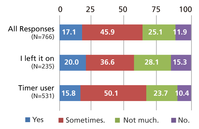 2. “I left it on all night. - 23.5%”, “I use timer - 53.1%”, those who use the timer are almost 2 times more than those who leave it on all night!